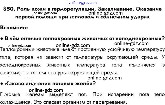 Готовые домашние задания по Биологии за 8 класс Учебник Драгомилов, Маш Алгоритм успеха 2022 - §50. Роль кожи в терморегуляции. Закаливание. Оказание первой помощи при тепловом и солнечном ударах Глава 9. Мочевыделительная система и кожа Вспомним
