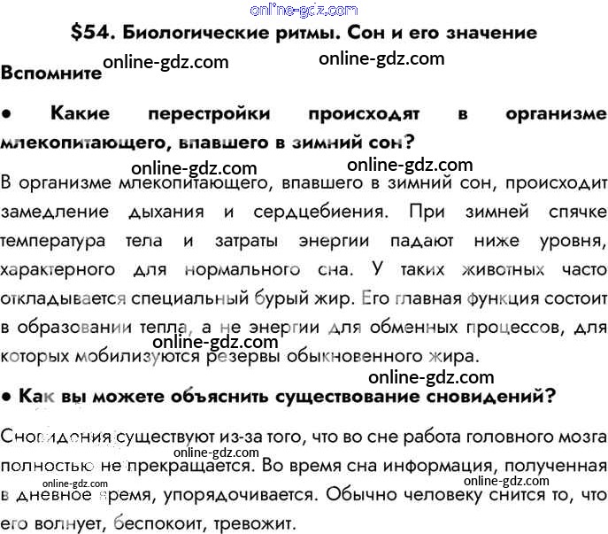Готовые домашние задания по Биологии за 8 класс Учебник Драгомилов, Маш Алгоритм успеха 2022 - §54. Биологические ритмы. Сон и его значение Глава 10. Поведение и психика Вспомним