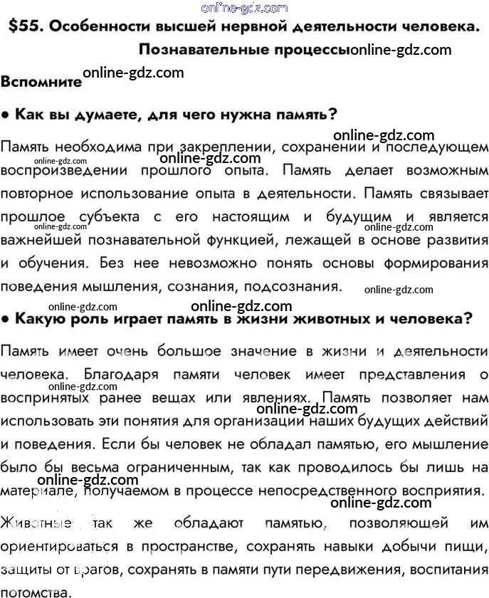 Готовые домашние задания по Биологии за 8 класс Учебник Драгомилов, Маш Алгоритм успеха 2022 - §55. Особенности высшей нервной деятельности человека. Познавательные процессы Глава 10. Поведение и психика Вспомним