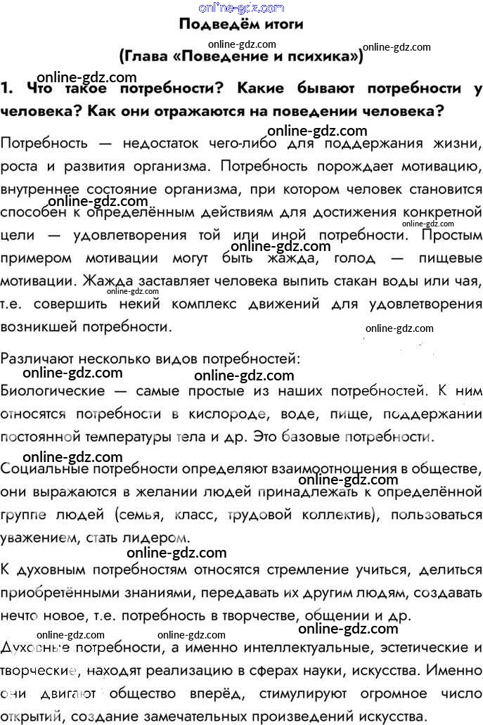 Готовые домашние задания по Биологии за 8 класс Учебник Драгомилов, Маш Алгоритм успеха 2022 - Подведём итоги Глава 10. Поведение и психика 1