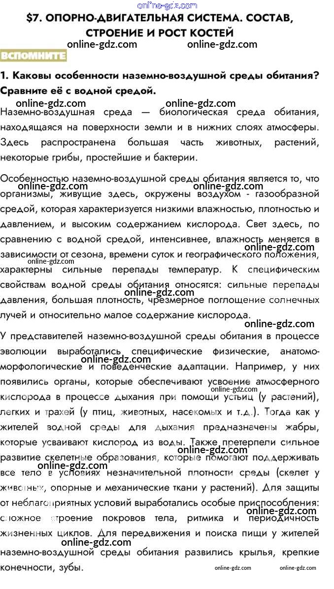 Готовые домашние задания по Биологии за 8 класс Учебник Пасечник, Каменский Линия жизни 2016 - Вспомните §7. Опорно-двигательная система. Состав, строение и рост костей 1