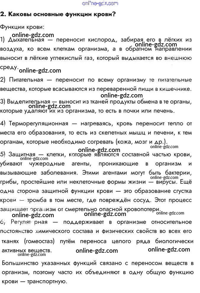 Готовые домашние задания по Биологии за 8 класс Учебник Пасечник, Каменский Линия жизни 2016 - Вопросы §13. Состав внутренней среды организма и её функции 2