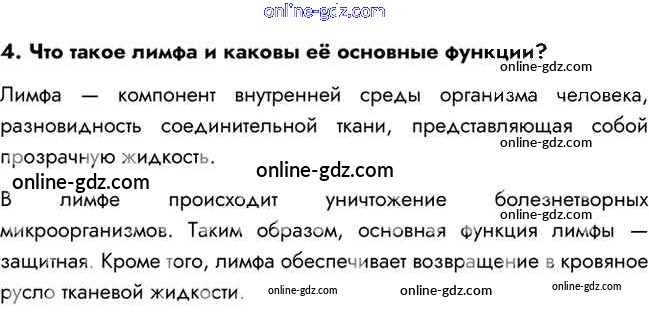 Готовые домашние задания по Биологии за 8 класс Учебник Пасечник, Каменский Линия жизни 2016 - Вопросы §13. Состав внутренней среды организма и её функции 4