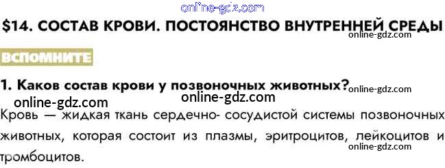 Готовые домашние задания по Биологии за 8 класс Учебник Пасечник, Каменский Линия жизни 2016 - Вспомните §14. Состав крови. Постоянство внутренней среды 1