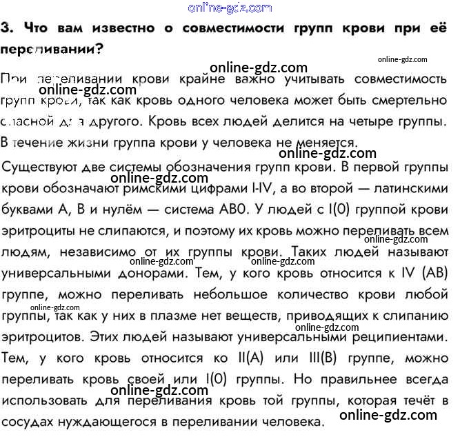 Готовые домашние задания по Биологии за 8 класс Учебник Пасечник, Каменский Линия жизни 2016 - Вопросы §15. Свёртывание крови. Переливание крови. Группы крови 3