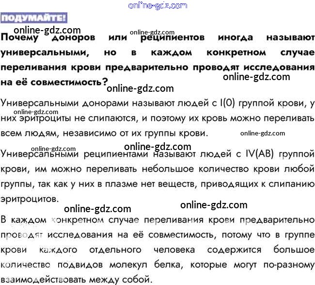 Готовые домашние задания по Биологии за 8 класс Учебник Пасечник, Каменский Линия жизни 2016 - Подумайте §15. Свёртывание крови. Переливание крови. Группы крови 1