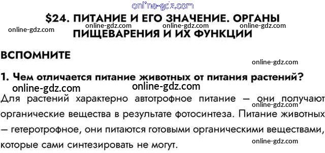 Готовые домашние задания по Биологии за 8 класс Учебник Пасечник, Каменский Линия жизни 2016 - Вспомните §24. Питание и его значение. Органы пищеварения и их функции 1