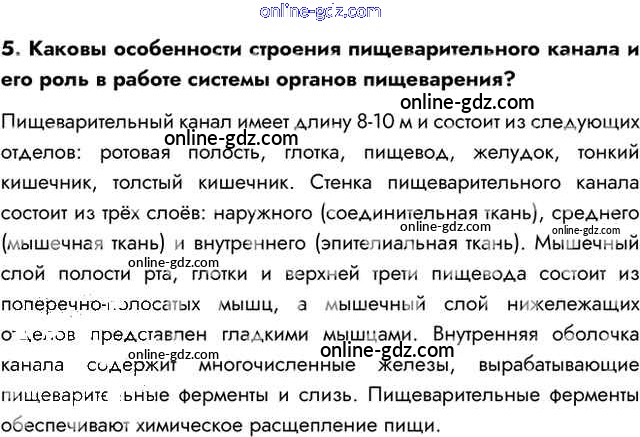 Готовые домашние задания по Биологии за 8 класс Учебник Пасечник, Каменский Линия жизни 2016 - Вопросы §24. Питание и его значение. Органы пищеварения и их функции 5