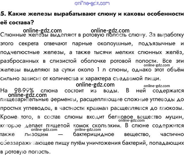 Готовые домашние задания по Биологии за 8 класс Учебник Пасечник, Каменский Линия жизни 2016 - Вопросы §25. Пищеварение в ротовой полости. Глотка и пищевод 5