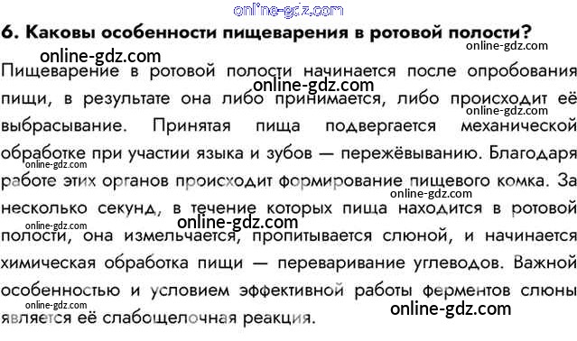 Готовые домашние задания по Биологии за 8 класс Учебник Пасечник, Каменский Линия жизни 2016 - Вопросы §25. Пищеварение в ротовой полости. Глотка и пищевод 6