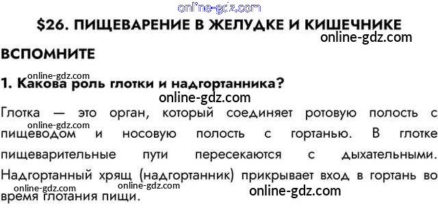 Готовые домашние задания по Биологии за 8 класс Учебник Пасечник, Каменский Линия жизни 2016 - Вспомните §26. Пищеварение в желудке и кишечнике 1