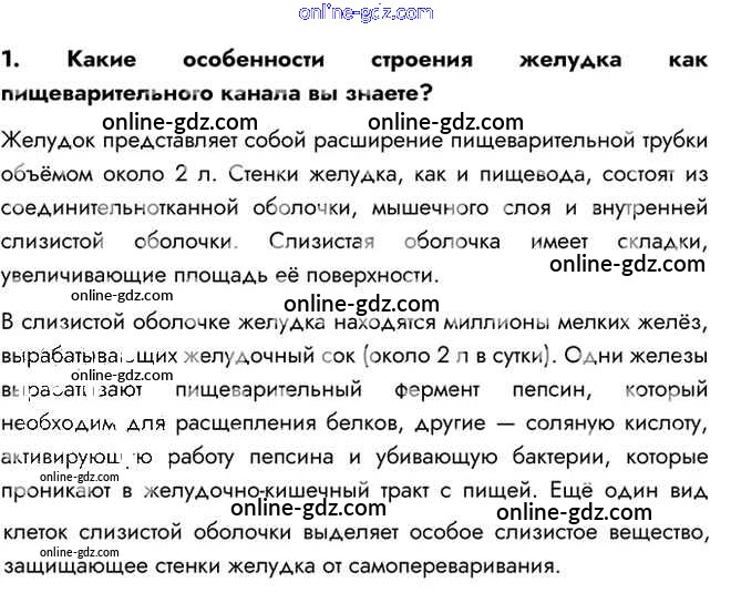 Готовые домашние задания по Биологии за 8 класс Учебник Пасечник, Каменский Линия жизни 2016 - Вопросы §26. Пищеварение в желудке и кишечнике 1