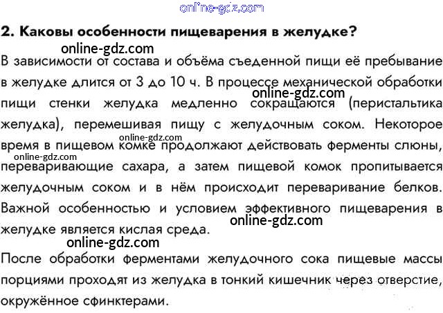 Готовые домашние задания по Биологии за 8 класс Учебник Пасечник, Каменский Линия жизни 2016 - Вопросы §26. Пищеварение в желудке и кишечнике 2