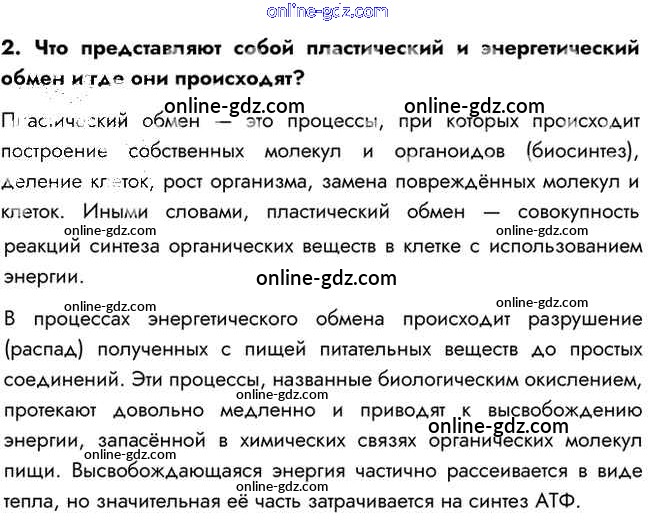 Готовые домашние задания по Биологии за 8 класс Учебник Пасечник, Каменский Линия жизни 2016 - Вопросы §29. Пластический и энергетический обмен 2