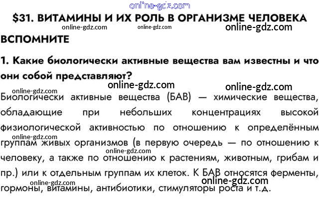 Готовые домашние задания по Биологии за 8 класс Учебник Пасечник, Каменский Линия жизни 2016 - Вспомните §31. Витамины и их роль в организме человека 1