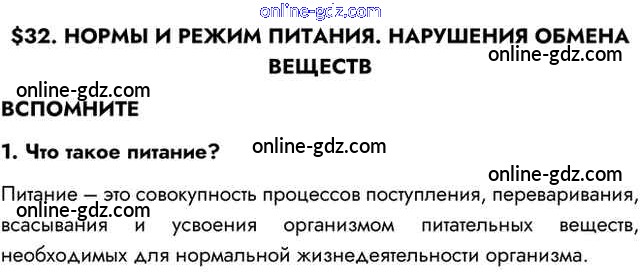 Готовые домашние задания по Биологии за 8 класс Учебник Пасечник, Каменский Линия жизни 2016 - Вспомните §32. Нормы и режим питания. Нарушения обмена веществ 1