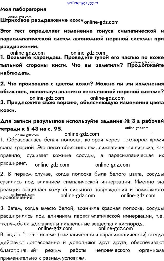 Готовые домашние задания по Биологии за 8 класс Учебник Пасечник, Каменский Линия жизни 2016 - Моя лаборатория §43. Вегетативная нервная система 1