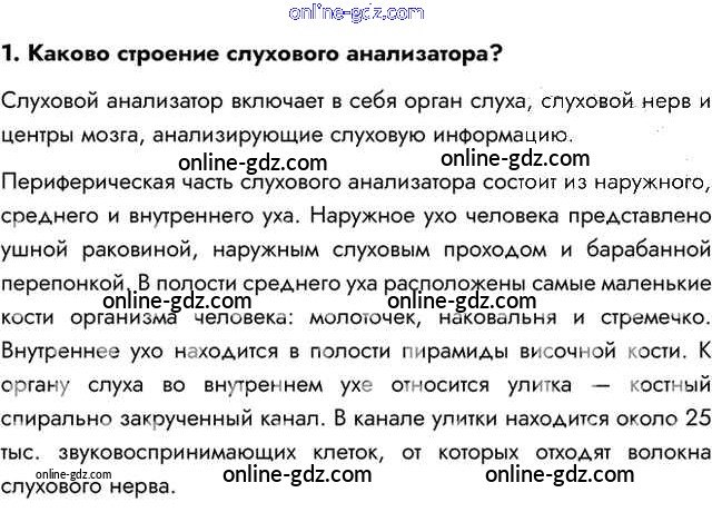 Готовые домашние задания по Биологии за 8 класс Учебник Пасечник, Каменский Линия жизни 2016 - Вопросы §46. Слуховой анализатор 1