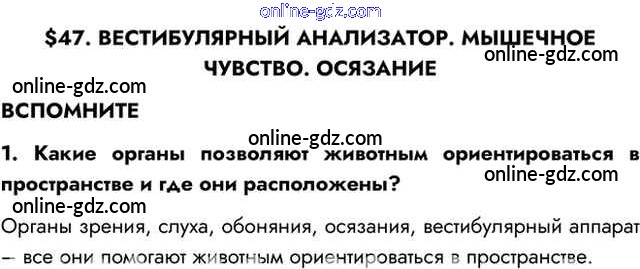 Готовые домашние задания по Биологии за 8 класс Учебник Пасечник, Каменский Линия жизни 2016 - Вспомните §47. Вестибулярный анализатор. Мышечное чувство. Осязание 1