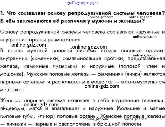 Готовые домашние задания по Биологии за 8 класс Учебник Пасечник, Каменский Линия жизни 2016 - Вопросы §55. Органы размножения. Половые клетки. Оплодотворение 1