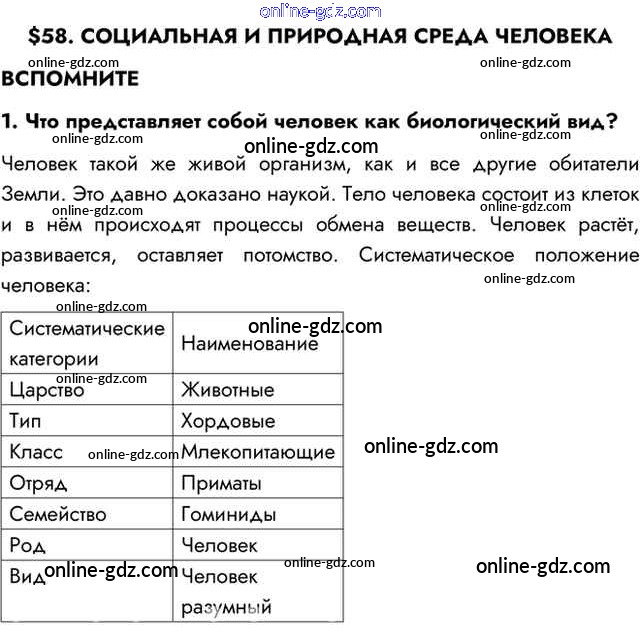 Готовые домашние задания по Биологии за 8 класс Учебник Пасечник, Каменский Линия жизни 2016 - Вспомните §58. Социальная и природная среда человека 1