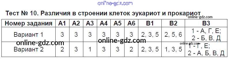 Готовые домашние задания по Биологии за 9 класс Контрольно-измерительные материалы (КИМ) Богданов 2017 - Тесты Тест №10. Различия в строении клеток эукариот и прокариот