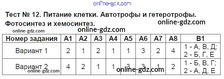 Готовые домашние задания по Биологии за 9 класс Контрольно-измерительные материалы (КИМ) Богданов 2017 - Тесты Тест №12. Питание клетки. Автотрофы и гетеротрофы. Фотосинтез и хемосинтез