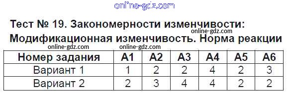 Готовые домашние задания по Биологии за 9 класс Контрольно-измерительные материалы (КИМ) Богданов 2017 - Тесты Тест №19. Закономерности изменчивости - Модификационная изменчивость. Норма реакции