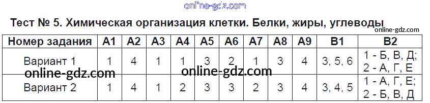Готовые домашние задания по Биологии за 9 класс Контрольно-измерительные материалы (КИМ) Богданов 2017 - Тесты Тест №5. Химическая организация клетки. Белки, жиры, углеводы