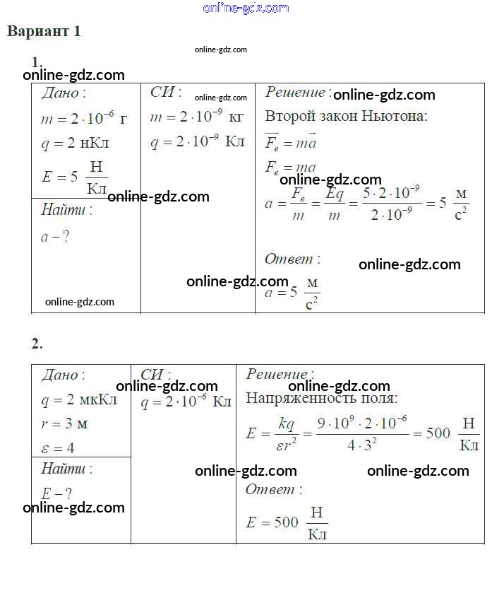 Готовые домашние задания по Физике за 10 класс Самостоятельные и контрольные работы Ерюткин, Ерюткина Базовый и углубленный уровень 2018 - СР №2 Электростатика 1