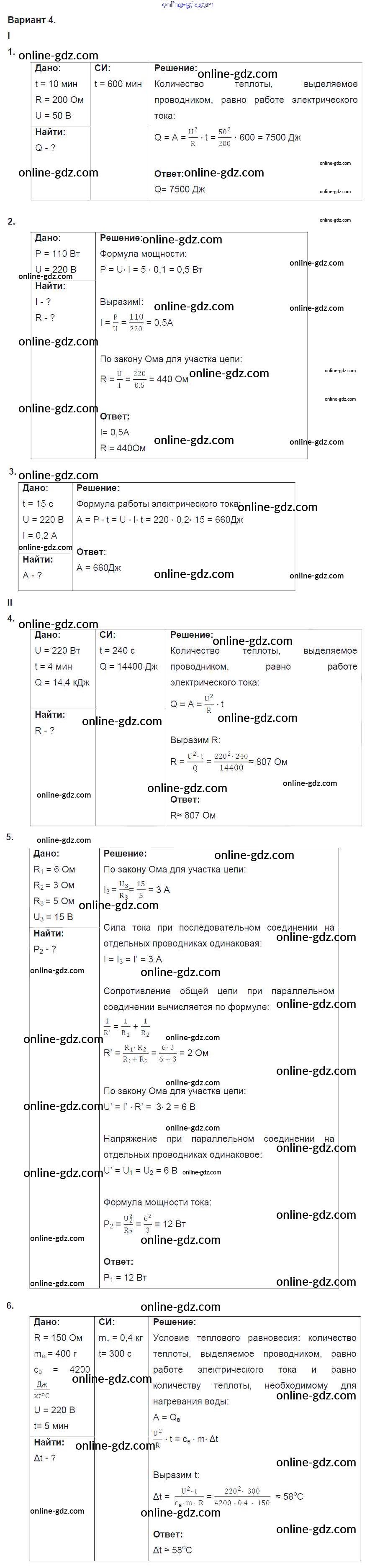Готовые домашние задания по Физике за 8 класс Дидактические материалы Марон Вертикаль 2016 - КР №4. Работа и мощность тока. Варианты Контрольные работы 4