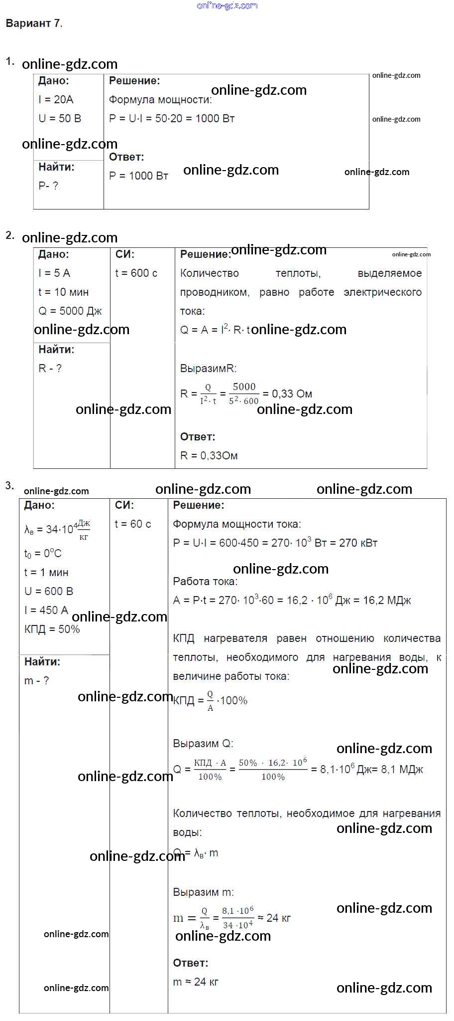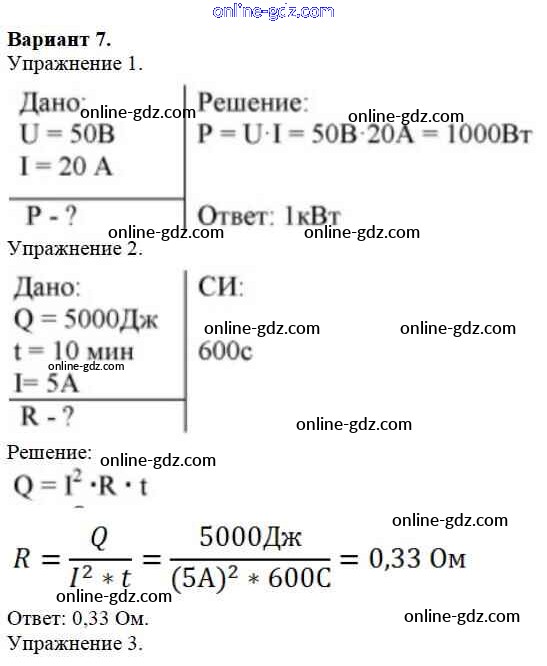 Готовые домашние задания по Физике за 8 класс Дидактические материалы Марон Вертикаль 2016 - СР №10. Работа и мощность тока. Варианты Самостоятельные работы 7