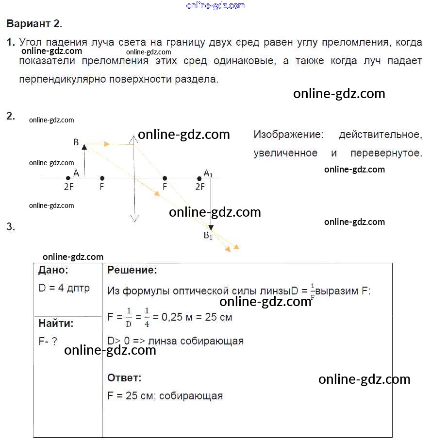 Готовые домашние задания по Физике за 8 класс Дидактические материалы Марон Вертикаль 2016 - СР №13. Преломление света. Линзы. Варианты Самостоятельные работы 2