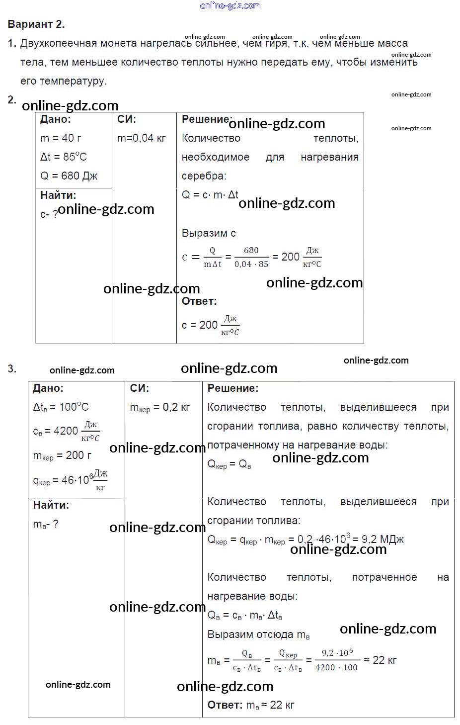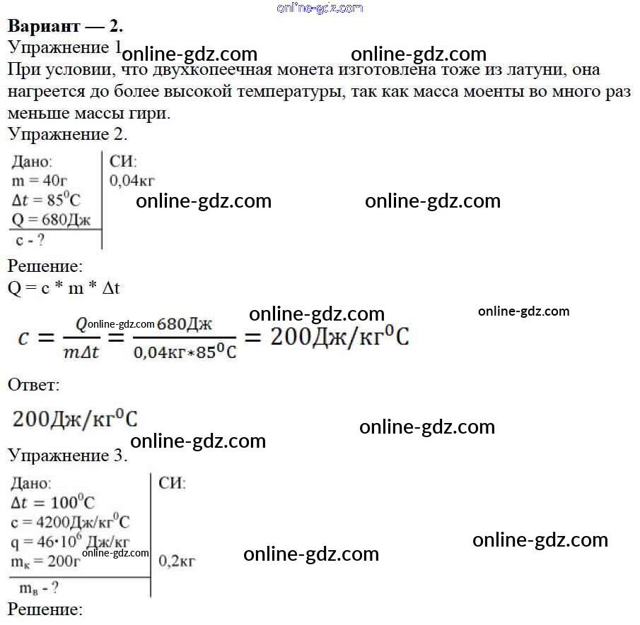 Готовые домашние задания по Физике за 8 класс Дидактические материалы Марон Вертикаль 2016 - СР №3. Количество теплоты. Энергия топлива. Варианты Самостоятельные работы 2