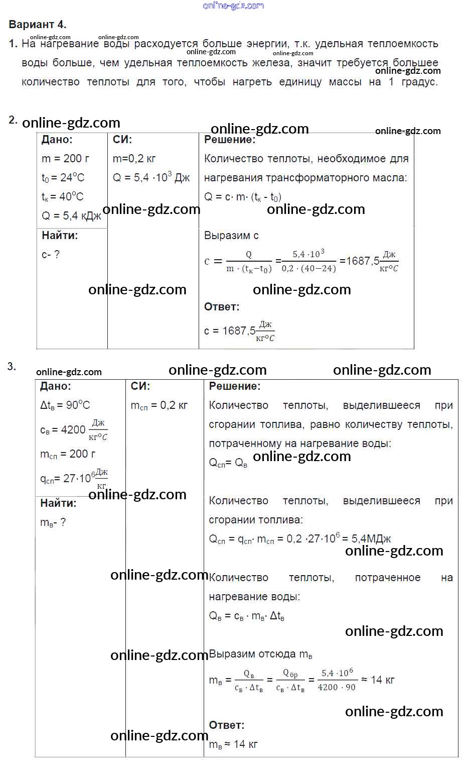 Готовые домашние задания по Физике за 8 класс Дидактические материалы Марон Вертикаль 2016 - СР №3. Количество теплоты. Энергия топлива. Варианты Самостоятельные работы 4