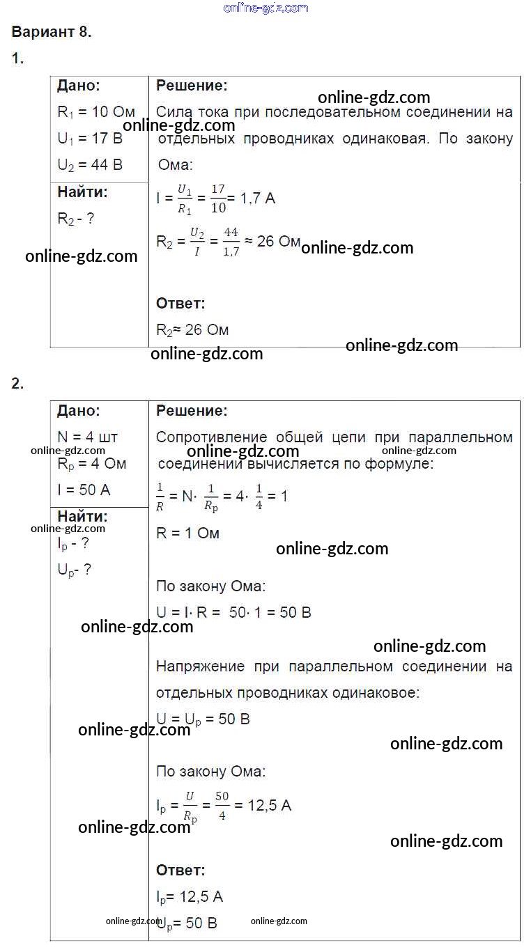 Готовые домашние задания по Физике за 8 класс Дидактические материалы Марон Вертикаль 2016 - СР №9. Соединение проводников. Варианты Самостоятельные работы 8
