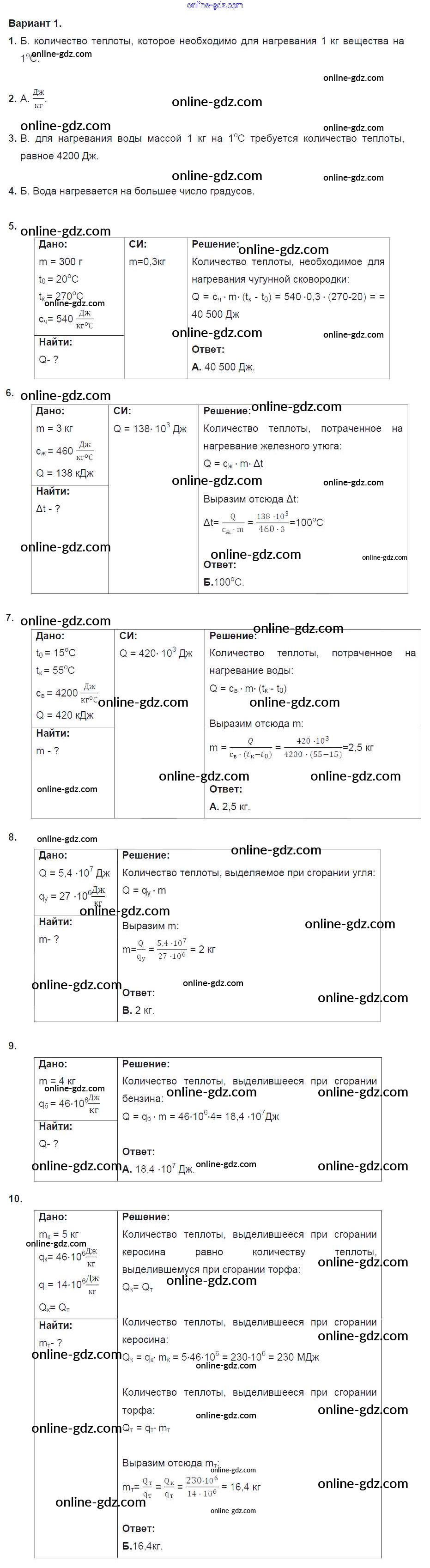 Готовые домашние задания по Физике за 8 класс Дидактические материалы Марон Вертикаль 2016 - Тест №2. Количество теплоты. Энергия топлива. Варианты Тесты для самоконтроля 1
