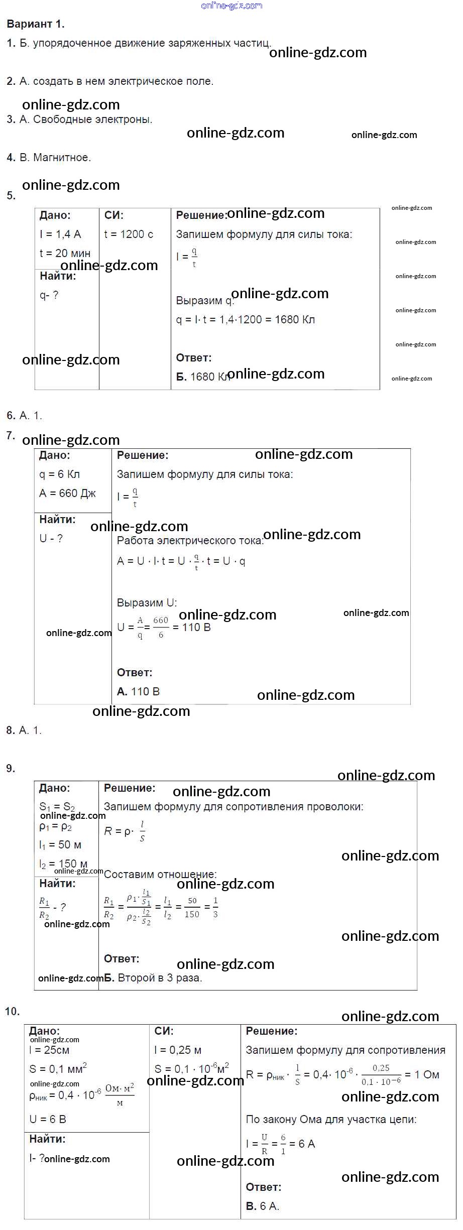Готовые домашние задания по Физике за 8 класс Дидактические материалы Марон Вертикаль 2016 - Тест №6.Сила тока. Напряжение. Сопротивление. Закон Ома для участка цепи. Варианты Тесты для самоконтроля 1