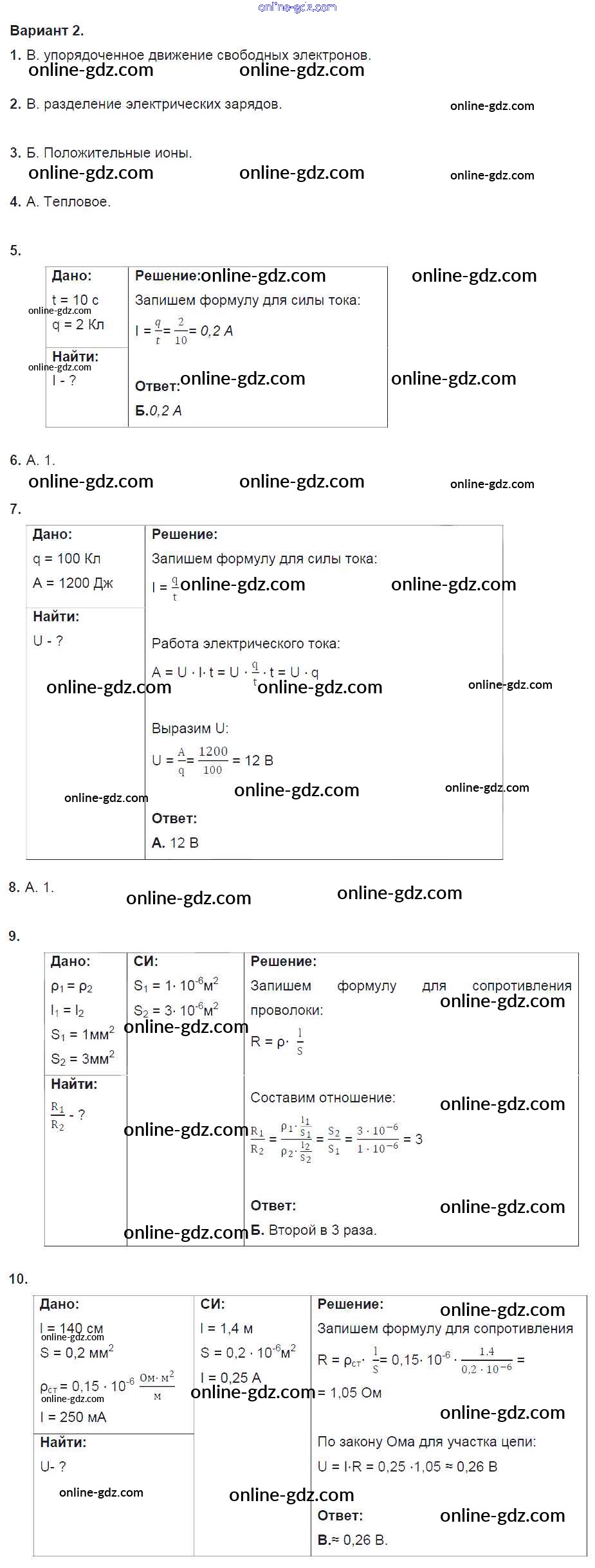Готовые домашние задания по Физике за 8 класс Дидактические материалы Марон Вертикаль 2016 - Тест №6.Сила тока. Напряжение. Сопротивление. Закон Ома для участка цепи. Варианты Тесты для самоконтроля 2