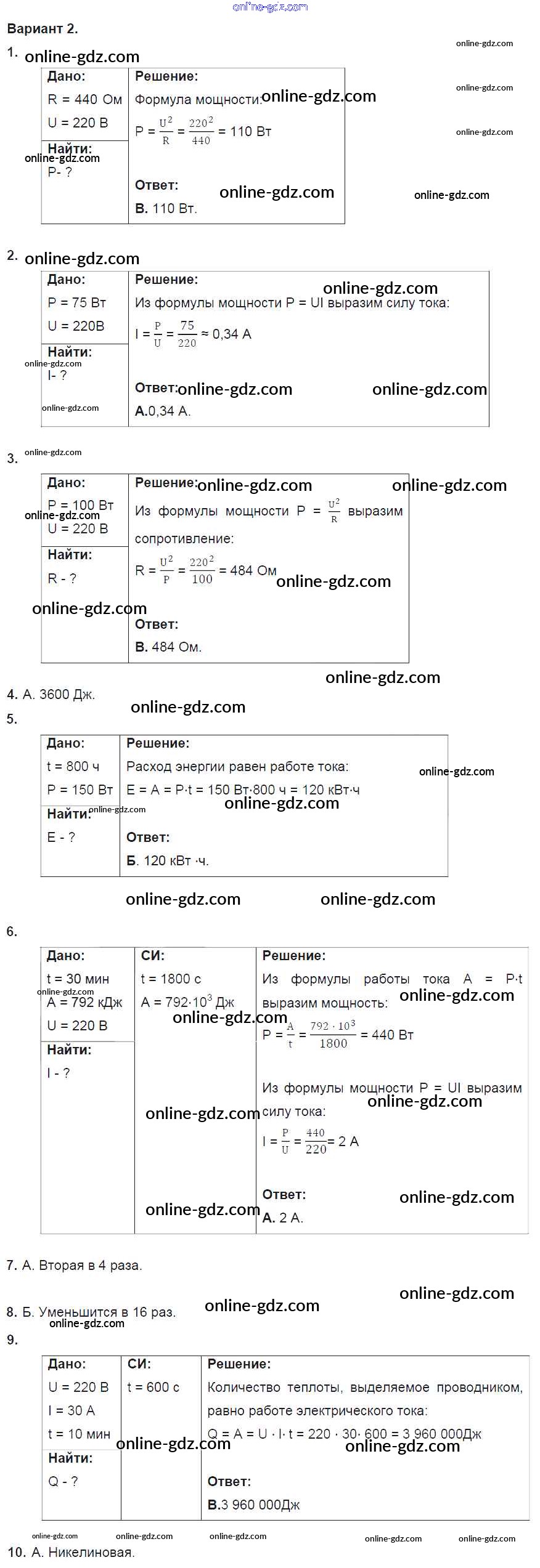 Готовые домашние задания по Физике за 8 класс Дидактические материалы Марон Вертикаль 2016 - Тест №8. Работа и мощность тока. Варианты Тесты для самоконтроля 2
