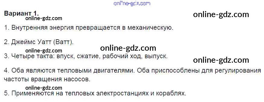 Готовые домашние задания по Физике за 8 класс Контрольные и самостоятельные работы Громцева УМК 2017 - СР №20. Работа газа и пара при расширении. Двигатель внутреннего сгорания. Паровая турбина Самостоятельные работы вариант-1