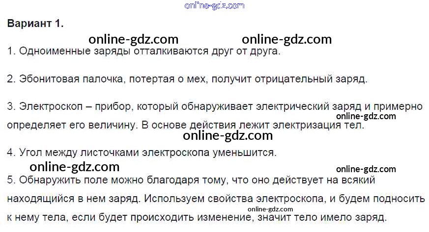 Готовые домашние задания по Физике за 8 класс Контрольные и самостоятельные работы Громцева УМК 2017 - СР №23. Взаимодействие заряженных тел. Электроскоп. Электрическое поле Самостоятельные работы вариант-1