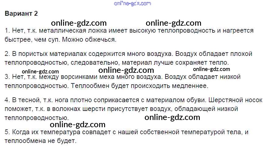 Готовые домашние задания по Физике за 8 класс Контрольные и самостоятельные работы Громцева УМК 2017 - СР №3. Теплопроводность Самостоятельные работы вариант-2