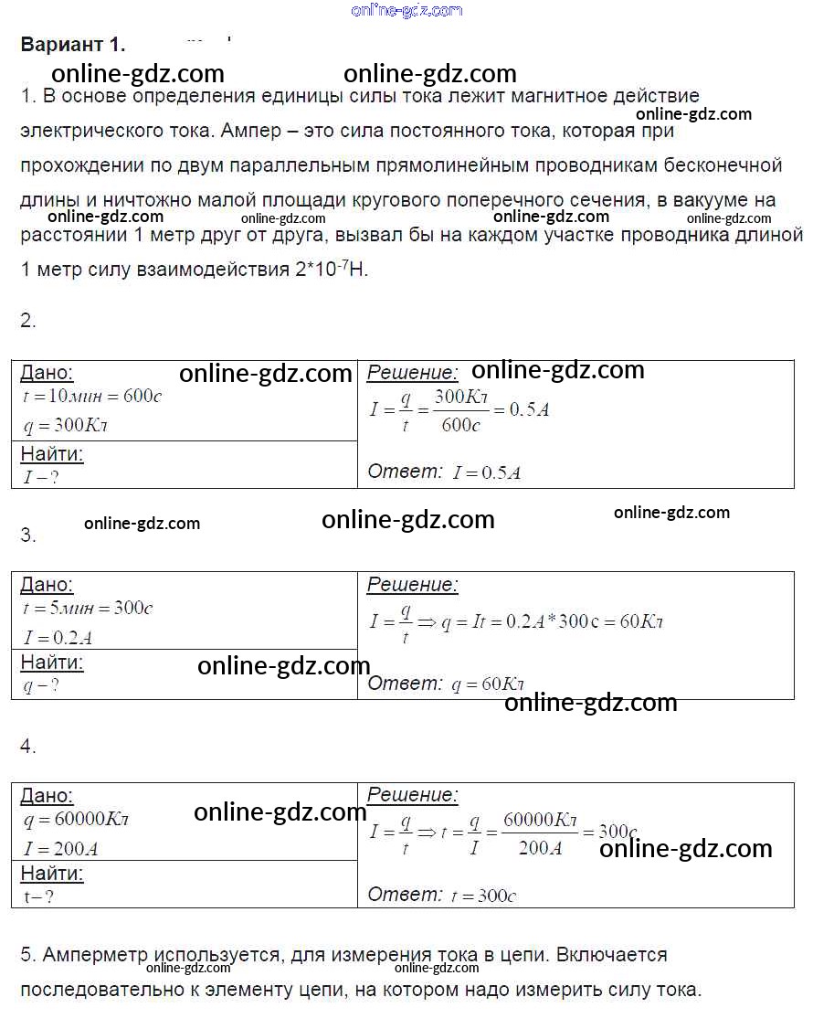 Готовые домашние задания по Физике за 8 класс Контрольные и самостоятельные работы Громцева УМК 2017 - СР №30. Сила тока. Единицы силы тока. Амперметр. Измерение силы тока Самостоятельные работы вариант-1