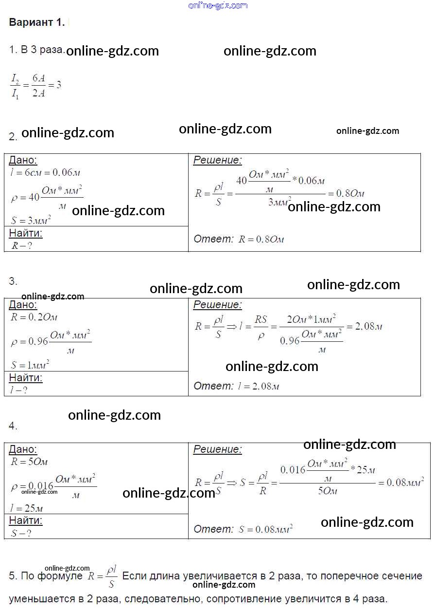 Готовые домашние задания по Физике за 8 класс Контрольные и самостоятельные работы Громцева УМК 2017 - СР №32. Зависимость силы тока от напряжения. Электрическое сопротивление проводников Самостоятельные работы вариант-1