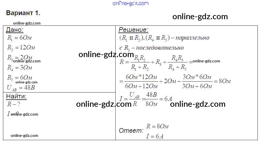 Готовые домашние задания по Физике за 8 класс Контрольные и самостоятельные работы Громцева УМК 2017 - СР №35. Последовательное и параллельное соединение проводников. Расчет полного сопротивления и силы тока в цепи Самостоятельные работы вариант-1