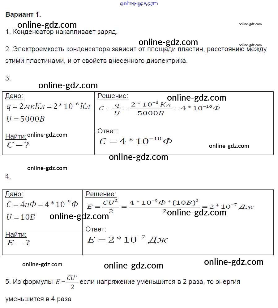 Готовые домашние задания по Физике за 8 класс Контрольные и самостоятельные работы Громцева УМК 2017 - СР №39. Конденсатор Самостоятельные работы вариант-1
