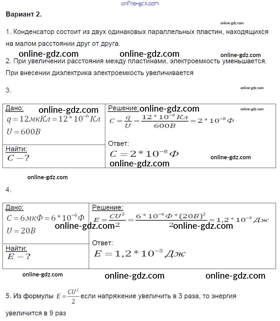 Готовые домашние задания по Физике за 8 класс Контрольные и самостоятельные работы Громцева УМК 2017 - СР №39. Конденсатор Самостоятельные работы вариант-2