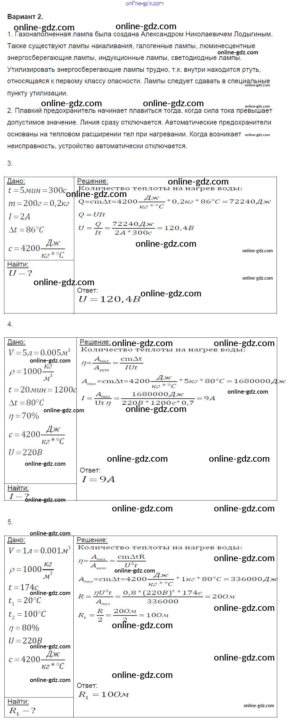 Готовые домашние задания по Физике за 8 класс Контрольные и самостоятельные работы Громцева УМК 2017 - СР №40. Лампа накаливания. Электрические нагревательные приборы. Короткое замыкание. Предохранители Самостоятельные работы вариант-2