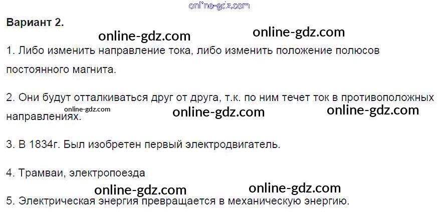 Готовые домашние задания по Физике за 8 класс Контрольные и самостоятельные работы Громцева УМК 2017 - СР №43. Действие магнитного поля на проводник с током. Электрический двигатель Самостоятельные работы вариант-2